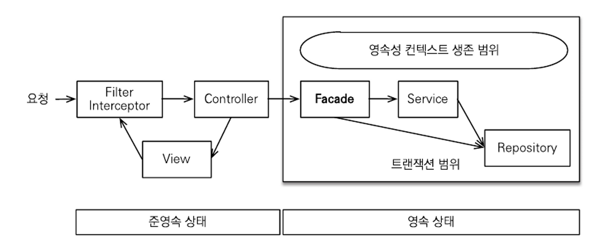 - 서비스와 리포지토리 계층에서는 영속 상태를 유지