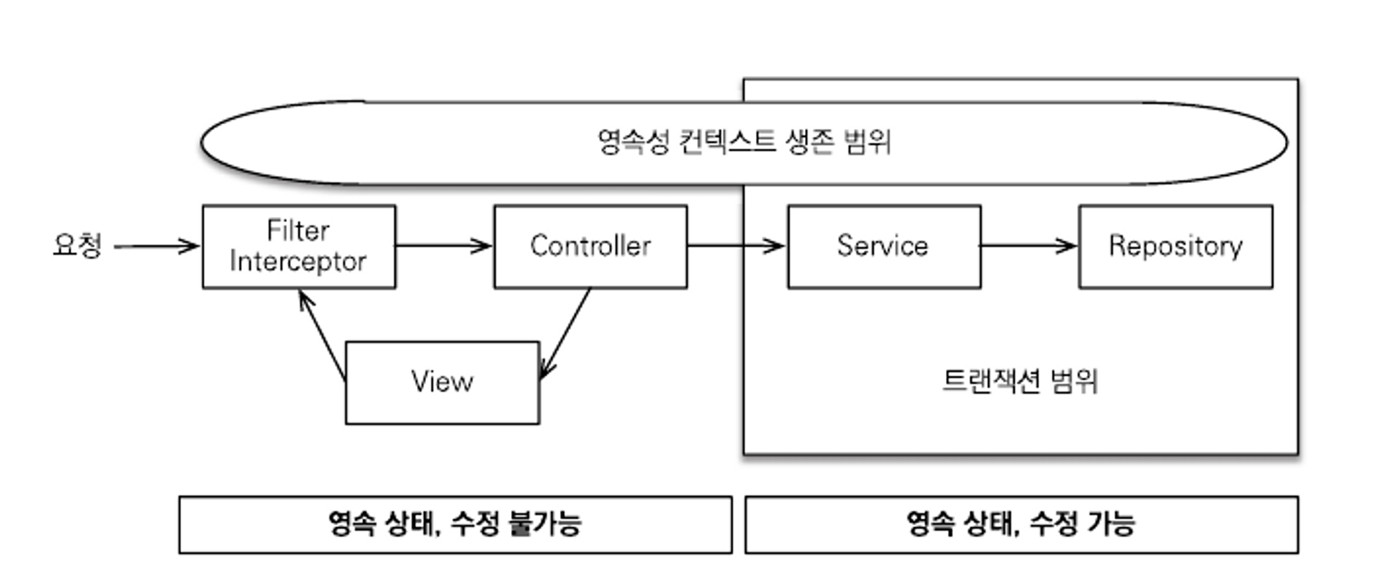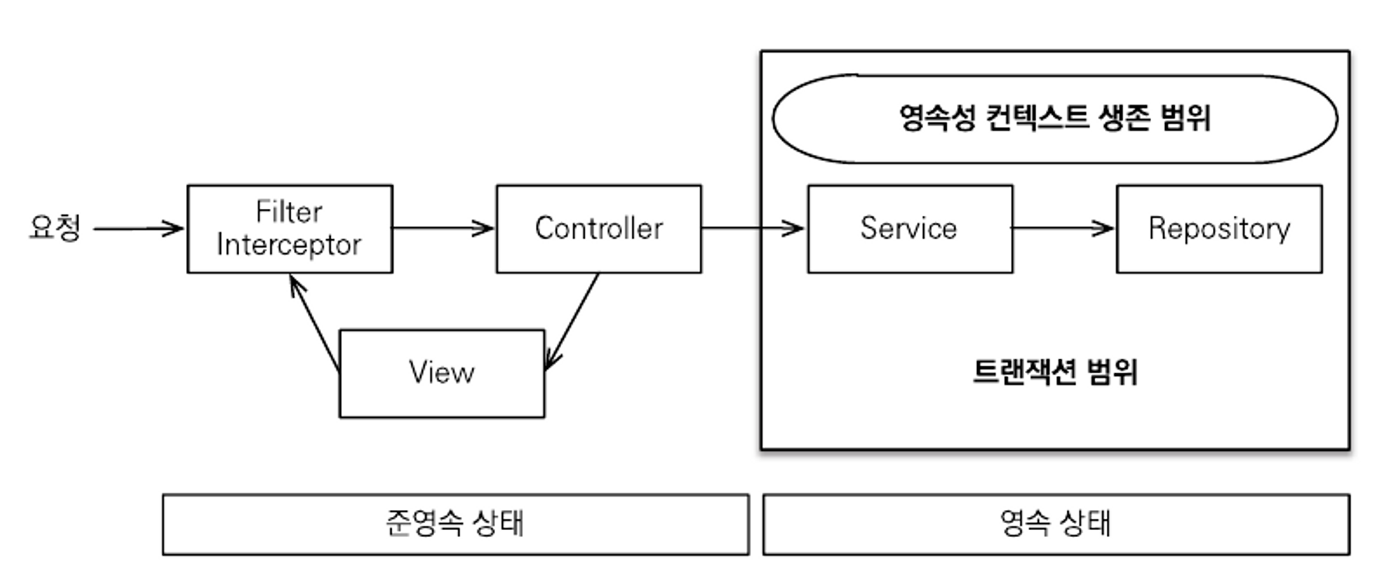 - 클라이언트의 요청이 들어오면 서블릿 필터나, 스프링 인터셉터에서 영속성 컨텍스트를 생성한다. 단, 이때 트랜잭션은 시작하지 않는다.