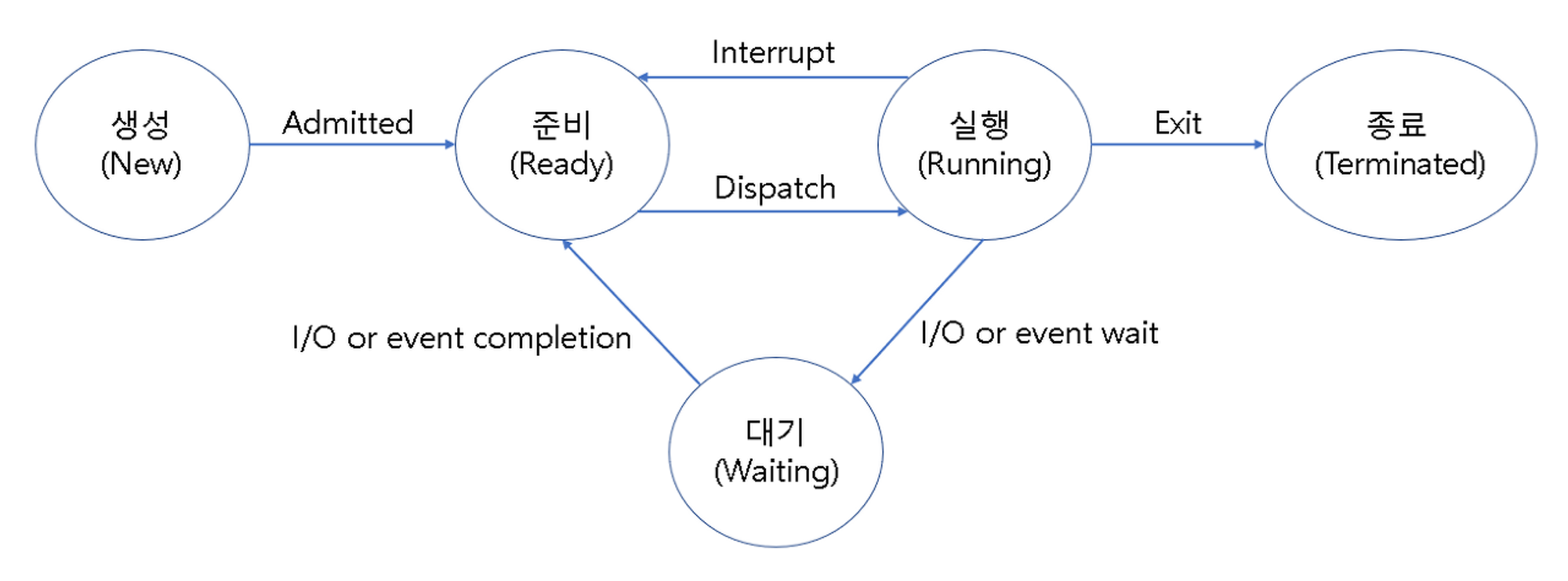 - 대기 상태 (waiting) : 프로세스가 입출력이나 이벤트 발생을 기다려야 해서 CPU 사용을 멈추고 기다리는 상태